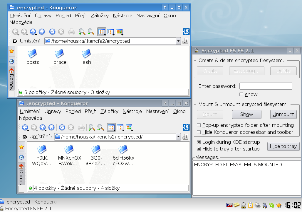 V příloze můžete vidět jak to nakonec vypadá. Nahoře data rozšifrovaná, dole zašifrovaná, v panelu je vidět ikonka od kencfs2 (vpravo).