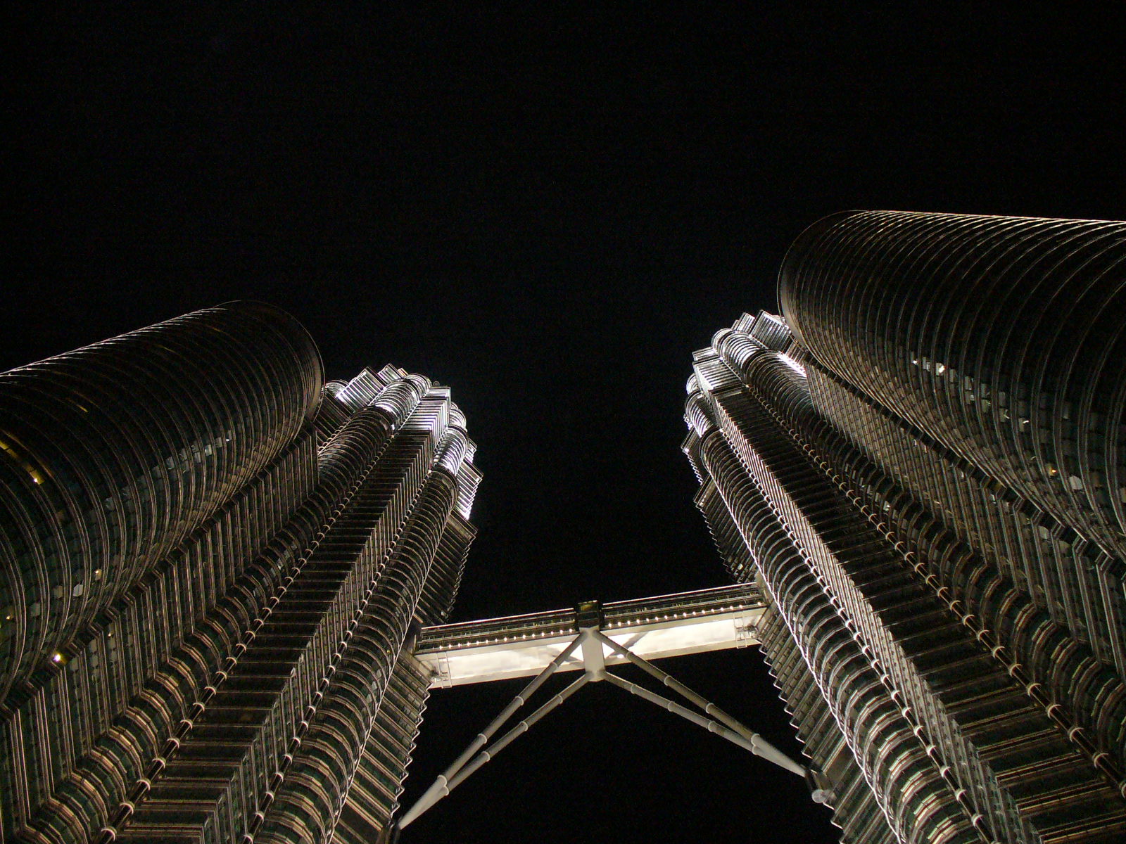 Ráno jsme se vydali na obhlídku města. První co nás zajímalo byly samozřejmě slavné Petronas Towers - největší dvojčata na světě. Bylo nám řečeno, že je o tuto atrakci velký zájem, a že nahoru se může každý den dostat jen omezený počet lidí, takže je dobé se tam vydat hned ráno. O půl deváté už jsme tedy stáli v řadě na lístky - ty jsou kupodivu zcela zdarma, a každý se s lístkem dozví i čas kdy má přijít. My jsme tedy měli dorazit o půl druhé, tak jsme se mezitím vydali na prohlídku zbytku města. Na první pohled je KL podobné Singapuru - spousta různých mrakodrapů, prostě moderní město. Ale na pohled druhý už je vidět rozdíl: postranní uličky jsou mnohdy špinavé, s povalujícími odpadky a bezdomovci. Před půl druhou už jsme už netrpělivě čekali na návštěvu Petronas - dlouhou chvíli jsme si krátili prohlížením expozice o samotných věžích a také prezentace o jejich ochraně před blesky doplněné efektní simulací s jejich modely a Teslovým generátorem. Věže byly postaveny malajskou ropnou společností Petronas, a dokončeny byly v roce 1998, do roku 2004 byly nejvyšší budovou na světě. Když na nás přišla řada, tak jsme dostali průvodkyni a po bezpečnostní kontrole jsme nastoupili do výtahu a vyjeli čtyřicetpět pater na můstek spojující obě věže. Tam jsme měli deset minut na rozhlížení a focení. A fotit bylo opravdu co, výhled byl úžasný, z té vyšky vypadali lidé i auta jako mravenci.