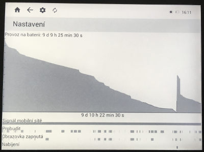 Čistě subjektivní záležitost, ale podle grafů vybíjení mi přijde čtečka silně podprůměrná co do výdrže baterie. Předchozí čtečky vydržely několik týdnů občasného čtení. inkBOOK dá přibližně jeden.