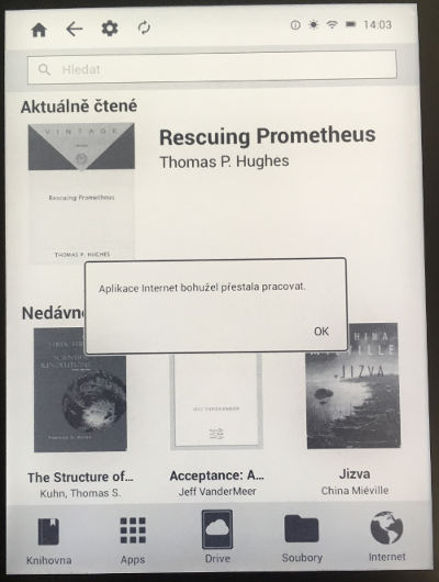 Reader čas od času zobrazuje po probuzení jen prázdnou bílou stránkou. Musí se vypnout a znova pustit, aby začal fungovat. Nestává se to moc často, odhadem tak jednou denně. Jindy prostě jen tak zatuhne:
