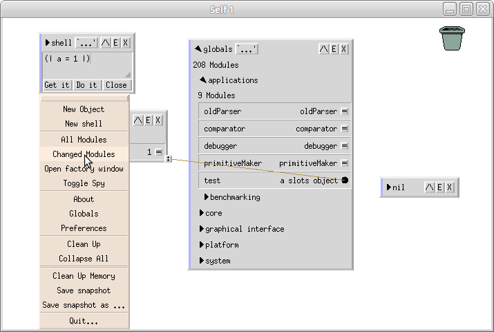 Nyní místo nilu graficky přenesu referenci na můj anonymní objekt na ploše. Stejně tak bych ale mohl přijít do mého anonymního objektu, otevřít si v něm shell a zadat cosi jako globals test: self.