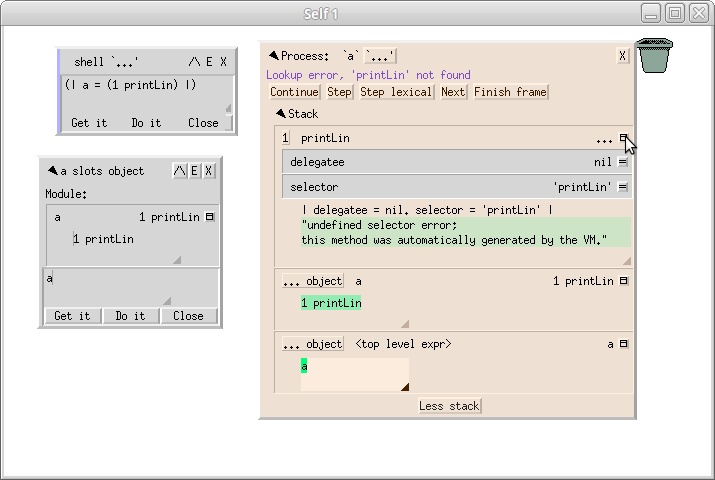 Self nabízí debugger smalltalkovského typu, ze kterého je možné interaktivně měnit kód. Krátká ukázka myslím řekne víc než tisíc slov.