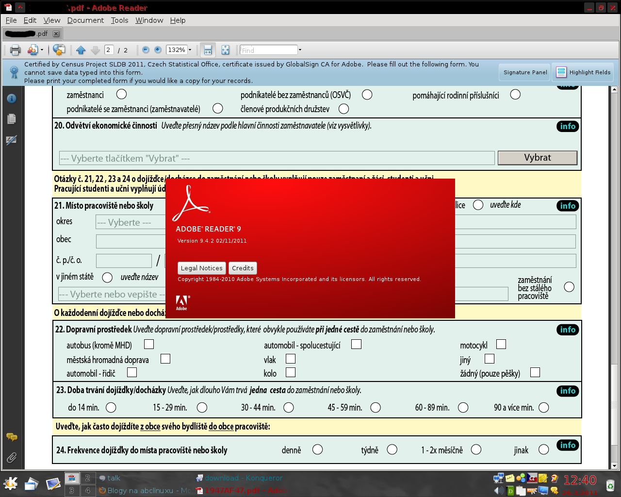 Zkusil jsem to tedy na Windows XP ve VirtualBoxu. Nainstaloval jsem si tam Adobe Reader X, protože na webu sčítaní píšou 9.0 nebo vyšší. Tak jsem to vyplnil, odeslal a místo potvrzujícího PDFka na mě koukal nějakej paskvil. Nevěděl jsem, jestli se to odeslalo.