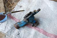 Řemenice na vodní pumpě se hýbala tak, že to vypadalo, že je vylágrované uložení ložiska a ty zvuky vypadaly tak, že ložisko taky brzy odejde. To by ale musela z pumpy okolo ložiska téct voda a to se nedělo. Vypustil jsem tedy chladící kapalinu do kanystříků po destilované vodě a začal s demontáží. Odpojil jsem hadice od chladiče, ten pak drží na čtyřech šroubech. Když jsem vyndal chladič, už se dalo dostat ke šroubům na vrtuli na řemenici vodní pumpy. Vyndal jsem ještě takovou síťku proti hmyzu, co mám ještě před chladičem, abych mohl případne prostrčit ruce skrz mezery v přední masce. Řemenice s vrtulí drží na čtyřech šroubech. Když jsem ji sundal, oddechl jsem si. Problém není v ložisku ani jeho uložení, ale v tom, že kolečko na hřídeli bylo přichycené dost fušersky. Bylo to lajdácky přivařené a sváry praskly. Pak se to kolečko hýbalo na hřídeli a bez odmontované řemenice to vypadalo na to vylágrované ložisko. Pak jsem odpojil hadici od pumpy k topnému tělísku topení. Když jsem sundal řemenici, šel dolů i řemen. Vodní pumpa drží také na čtyřech šroubech, dva jsou stejně dlouhé a další dva jsou každý jinak dlouhý, položil jsem si je bokem tak, abych to pak nepopletl.