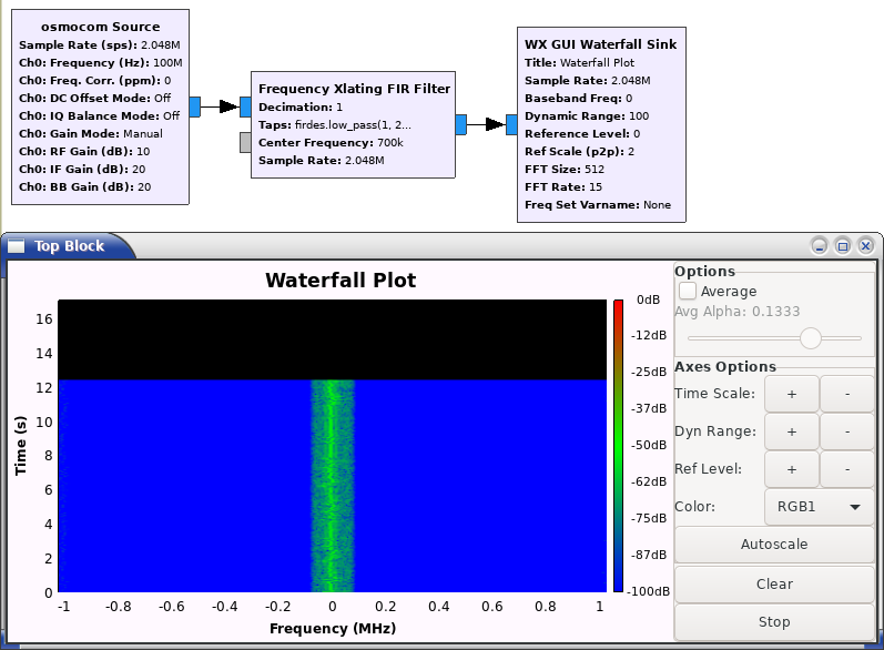 We need to set the sample rate. For rtl-sdr, set 2.048MHz (you can type for example 2.048e6, but SI multiplies are unfortunately not supported). Leave the frequency at 100MHz (or set some other where there is FM broadcast in the place where you live).