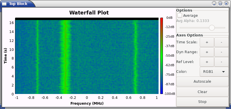 As the center frequency of our receiver is 100MHz, we can see that there is some strong signal at 99.7MHz (100-0.3) and two weaker signals at 99.3MHz and 100.7MHz.
