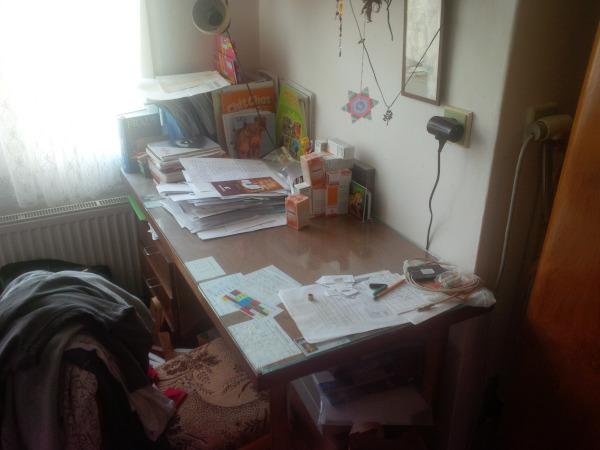 Jeho starý stůl se tak stal novým "studiem" on-line výuky naší mamky (foto 3). Jak vidíte, může se rovnou svalit vyčerpáním do postele. Její starý stůl (foto 4) jí postačoval, dokud docházela do školy, kde měla svůj kabinet. Kuchyň bývala v noci a o víkendech mou doménou, než začala s online výukou.