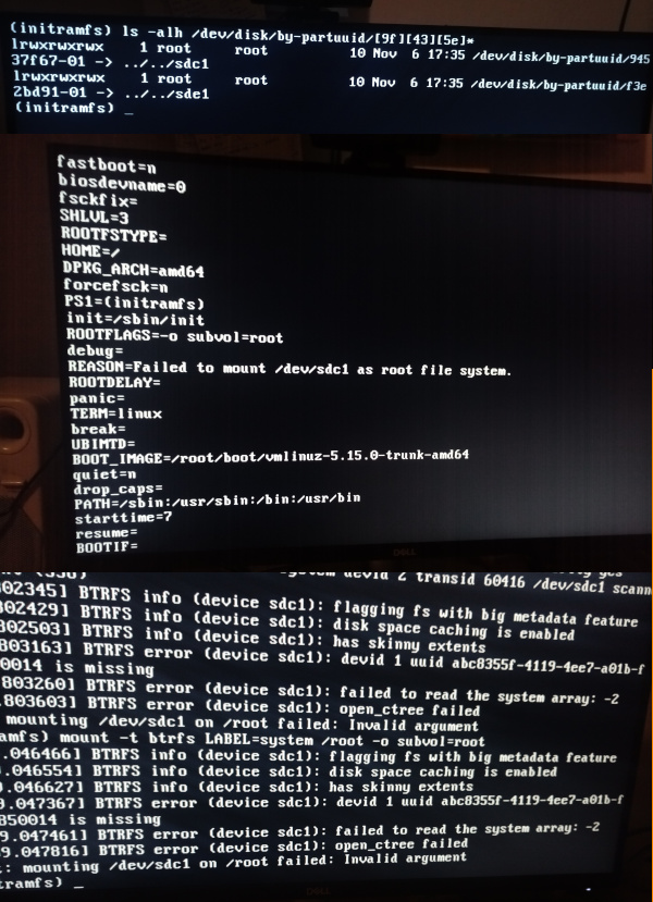 Následující snímek je pro ty, které zajímá, jak to v tom ramdisku vypadá, když se pokusíte to btrfs pole připojit přes LABEL. Třeba někdo přijde na to, proč to tak je.