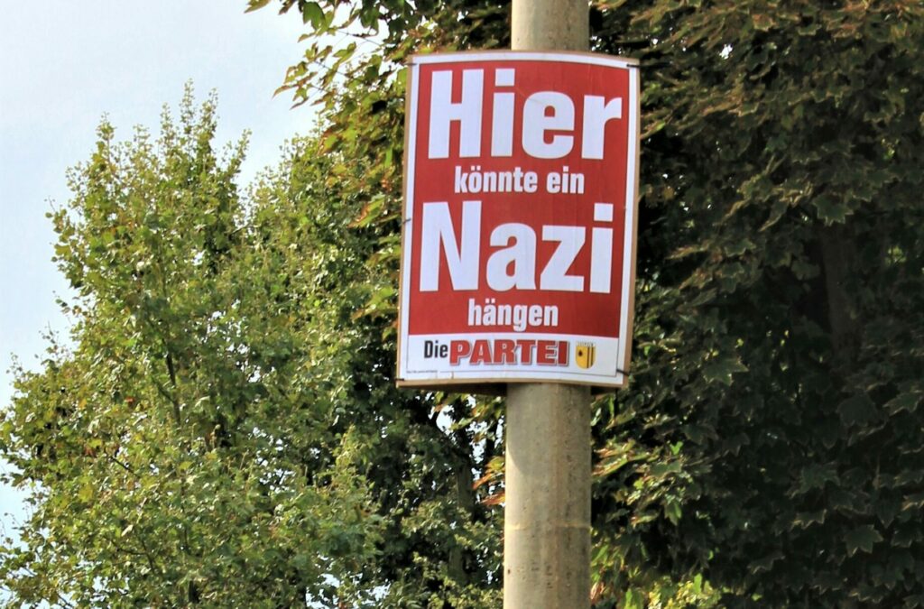 'Hier könnte ein Nazi hängen' -> 'zde by mohl viset nějaký nácek'. Takový plakát by myslím nebyl ani u nás od věci.