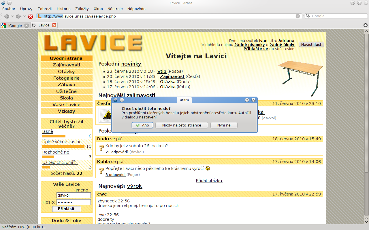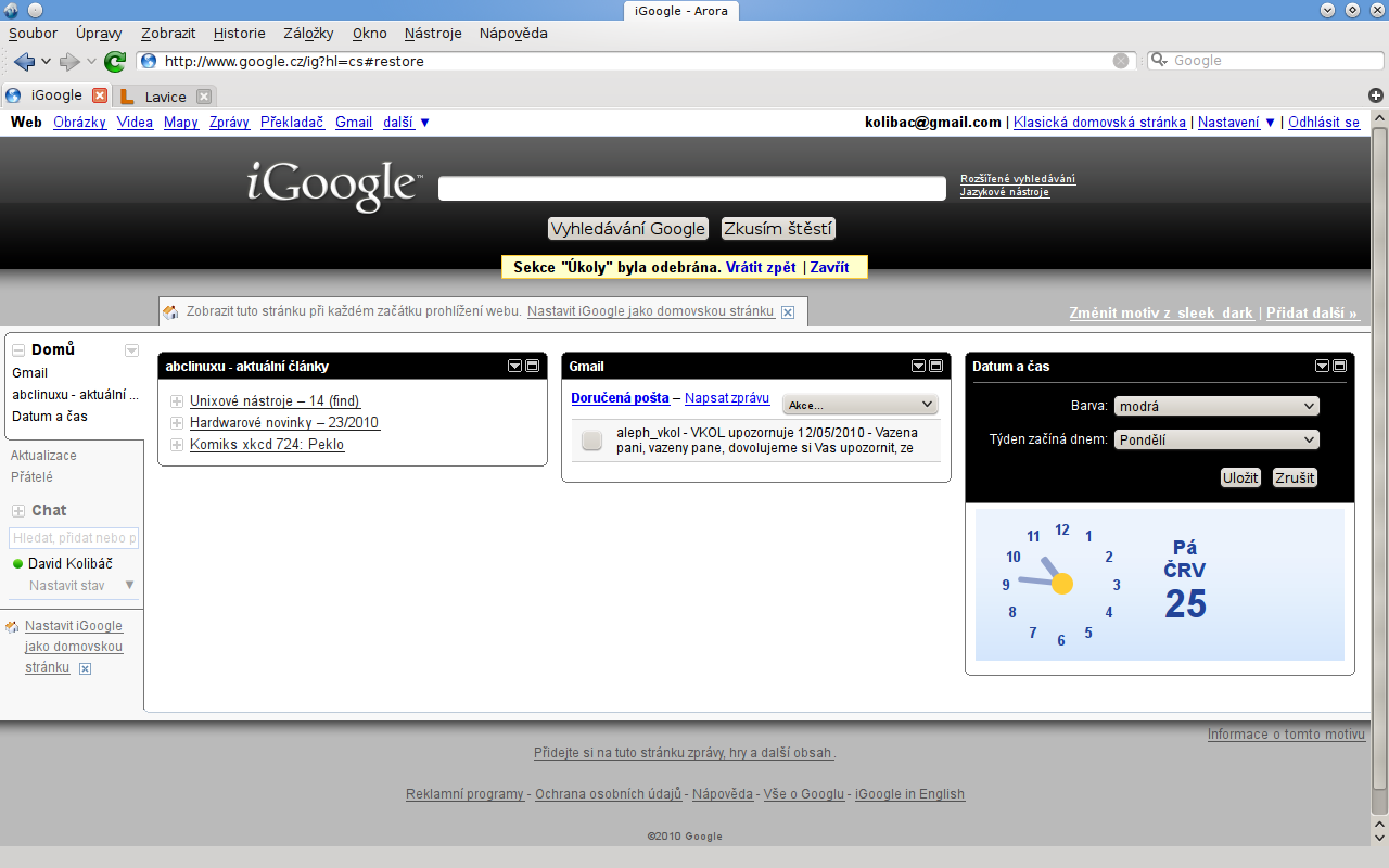 Se stabilitou jsem potíže neměl, rychlost byla příjemná, spotřeba paměti také (11,4 MB po spuštění). Vykreslování stránek je stejné jako v Aroře, vždyť oba prohlížeče používají stejnou komponentu Qt. Při použití v prostředí KDE si Rekonq sám načte záložky a cookies z Konqueroru.