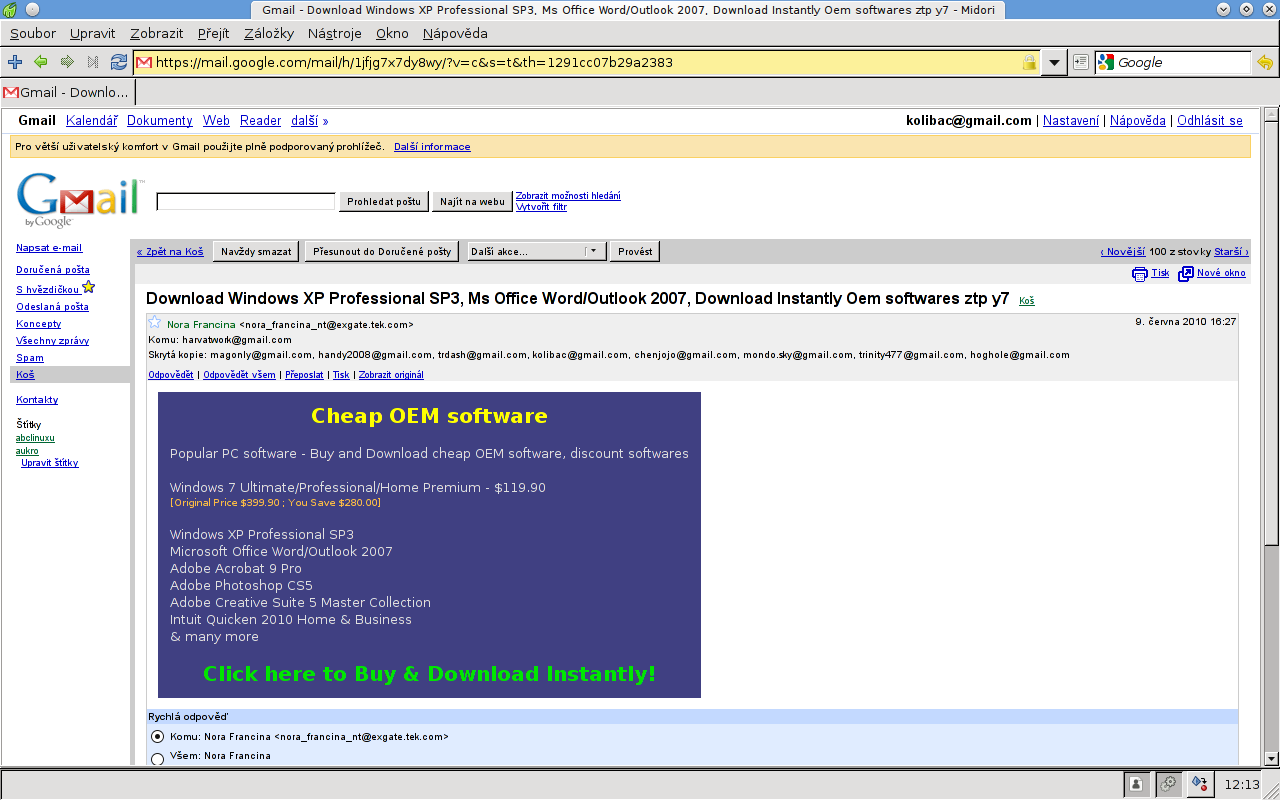 U Midori se asi zbláznili, nebo spíše je někdo podplatil, protože nasadili místo vyhledávání, které zajišťoval Google, od nové verze má zajišťovat Yahoo (viz Git). Jinak občas padá i bez Flashe, a se zapnutou volbou ukládání údajů formuláře nefunguje přihlašování do standardního rozhranní Gmailu. Nenačte se, a musíte se přepnout do HTML rozhraní, které navíc v Midori nefunguje správně (nejde do některých políček nic zadávat).