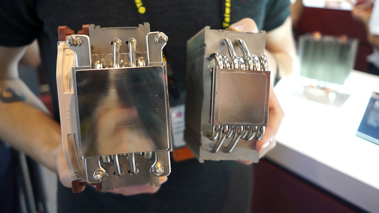 Mimochodem ještě k Threadripperu: jelikož jde o velký slepenec více čipů s atypicky velkou plochou heatspreaderu, tak i s ohledem na očekávané vysoké TDP (nejspíš 180 W, plus navíc to, co udělá případný overclocking) nebude možné s ním používat stávající chladiče, a to ani velké typu Noctua NH-D15. Třeba právě Noctua již připravuje nové chladiče (na fotografii výše), podobně i další výrobci, ale prozatím platí, že s Threadripperem balený vodník je vhodný výchozí chladič pro tuto hi-end platformu.