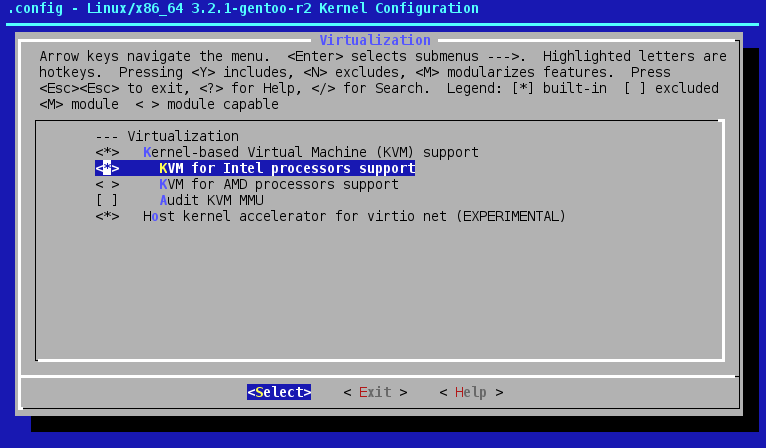 Pokud ani takový výstup nemáte, zkuste modprobe kvm-intel. Jestliže si jádro sestavujete sami, zkontrolujte nastavení pod Virtualization:
