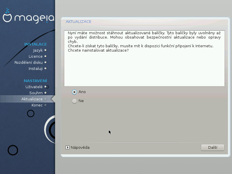 Pro aktualizace je potřeba vybrat zdroje internetové, o což se postará sama Mageia při prvním spuštění instalátoru a volby výběru zdrojů.