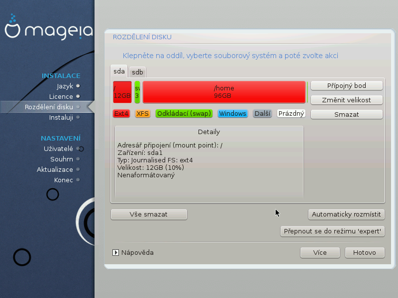 Naproti tomu vlastní čistá instalace nedělá žádné problémy. Proces je podobně poklidný a nestresující jako u Mageiy 2, instalátor důvěrně známý. Výběr jazyka – licence – nastavení diskových oddílů – instalační zdroje – buď rychlý výběr desktopu/nebo ruční konfigurace balíčků – nastavení rootova hesla a prvního uživatele – kontrola údajů – a je hotovo.