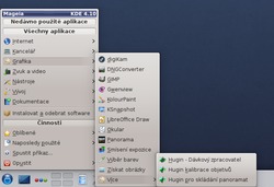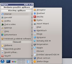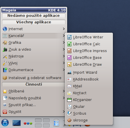 Rozvržení aplikací v menu (klasickém, ne Kicoff) je standardní, tedy některé aplikace jsou (dle mého zbytečně a často nevhodně) schovávány za položku „více“.