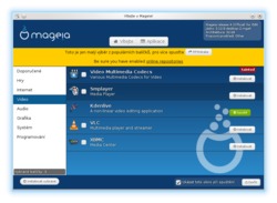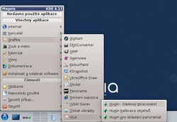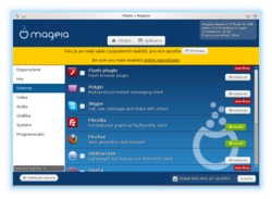 Ale zpátky k hlavní nabídce. Mageia se drží osvědčené klasiky, žádný Kickoff či „jiné vylomeniny“ se nekonají. Screenshoty ukazují, jaké aplikace instaluje distribuce po jednoduchém odkliknutí KDE desktopu při instalaci. Na jednu stranu je toho zde moc – třeba Filezilla, Konversation, Ktorrent či Scribus jednoznačně míří na zběhlejšího uživatele, ale nevadí, hlavně že nechybí ty opravdu podstatné věci jako Firefox, GIMP, Amarok, přehrávače videí (Dragon, „Videa“, Xine – vyberte si), správa a úprava fotografií (složitý digiKam i jednoduchý GwenView, plus zpracování panoramat v Huginu) a samozřejmě LibreOffice.