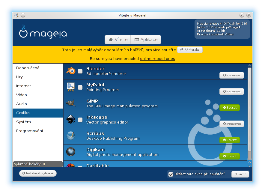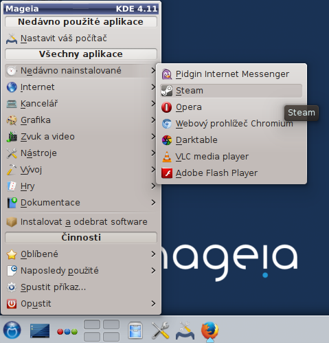 Aplikace se pak hned objeví v hlavní nabídce mezi nedávno instalovanými. Celkově je tato uvítací obrazovka vynikající záležitostí, skoro bych si až dovolil tvrdit, že pro uživatele Windows přecházejícího na Linux (či systém jen zkoušejícího), je toto nejpřehlednější a jeho návykům nejbližší cesta. Přitom nijak nenarušuje konzistenci a dojem ze samotného vydání Mageia 4 pro typického uživatele Linuxu. Nemusíte tuto uvítací obrazovku vůbec používat, prostě ji při prvním spuštění vypněte s tím, aby se již nespouštěla.