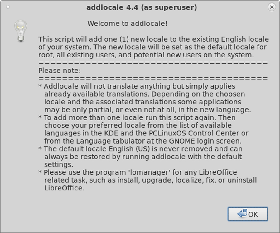 S ohledem na to, že ve výchozí podobě se systém instaluje v anglické verzi, ptá se po prvním spuštění, zdali chcete zachovat česky pojmenované adresáře, nebo je překlopit do anglických. Nedělejte to, hned přepneme systém do češtiny. Je na to přímo volba Add Locale v hlavním menu. Ta se postará o vše národního, stačí jen klikat na tlačítka typu YES a OK.