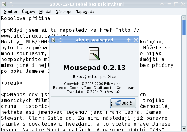 Mousepad, velice jednoduchý textový editor, již součástí instalace je. Chybí ale zvýrazňování syntaxe. Pokud tedy od textového editoru požadujete psaní něčeho víc než jen holých textů, nějakého jazyka, pak samozřejmě sáhněte třeba po Geditu.
