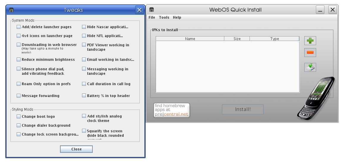 Jak tyto aplikace do telefonu snadno nainstalovat? Jelikož nejsou zahrnuty v Katalogu aplikací, došlo vývojářům, že jejich ruční instalace a správa by byla nanejvýš otravná a vytvořili dvě aplikace, které s tím uživateli pomohou. Jde o webOS Quick Install a Preware. První z nich je desktopová aplikace, která umožní, po získání root přístupu, instalovat do telefonu všechny nabalíkované aplikace jedním kliknutím.