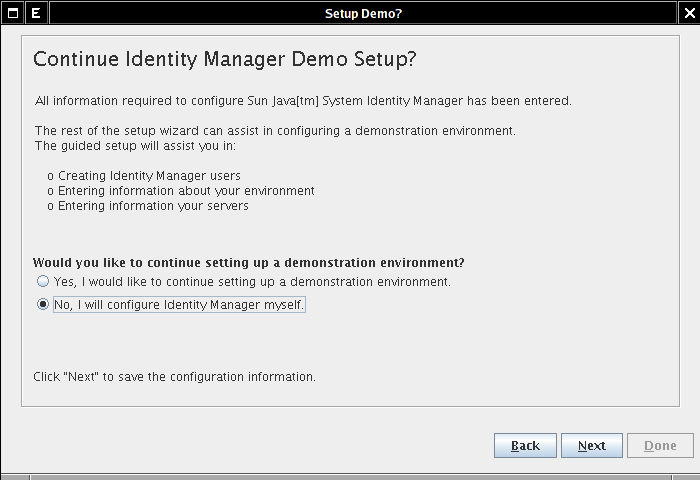Příkazem $WSHOME/bin/lh setup nastartujte konfigurační nástroj IDM pro dokončení instalace. Při výběru způsobu uložení dat (obrázek 2.8 - "Locate the Repository (files)") je jako výchozí možnost ukládání do lokálních souborů. Pokud se rozhodnete pro tuto variantu, je třeba, aby byl zvolený adresář přístupný a zapisovatelný pro uživatele, pod kterým běží aplikační server. Vyberte MySQL (JDBC Driver). Pokud jste měnili SQL skript pro vytváření databáze, budete muset změnit i údaje pro připojení k MySQL (obrázek 2.9 - "Locate the Repository (MySQL)"). Další kroky jsou shodné pro všechny způsoby ukládání dat. Během třetího kroku máte možnost nastavit demonstrační prostředí, zvolte možnost nevytvářet (obrázek 2.10 - "Setup Demo?"), IDM si nakonfigurujeme sami. Poslední krok je import dat do úložiště dat - klikněte na tlačítko Execute.