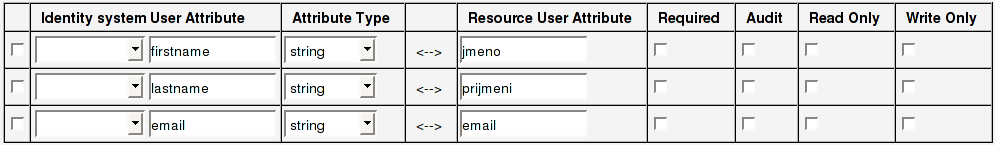 Account Attributes - Sloupečky z tabulky je potřeba namapovat na proměnné Identity Manageru, k tomu slouží další dialog v průvodci konfigurací. Sloupečky login a password jsou namapovány automaticky, zbývají tedy jen sloupečky jmeno, prijmeni a email.