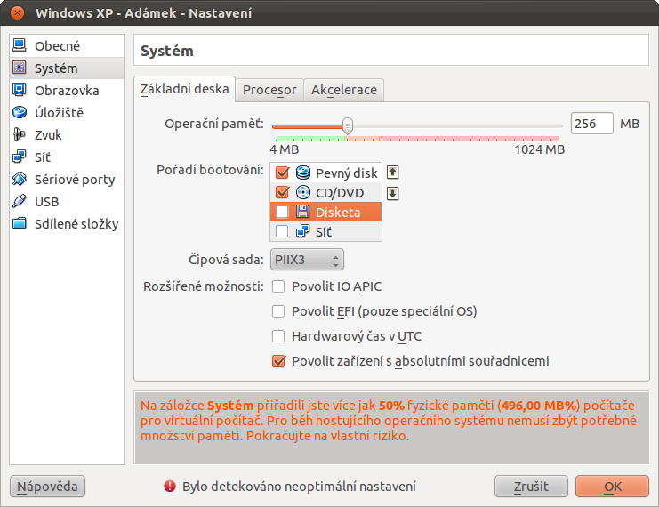 Se Systémem se v podstatě vracíme k tomu, co jsme měli také možnost nastavit již při vytváření virtuálního stroje. Na kartě Základní deska proto vybíráte velikost operační paměti, pořadí bootování, čipovou sadu a rozšíření. Samotnou změnu pořadí bootování provedete tak, že kliknete na některé z médií a pomocí šipky po pravé straně změníte jeho prioritu. Vhodné je zejména přesunout na 1. místo pevný disk – tedy ten virtuální. Mimochodem pokud po instalaci z ISO například neodpojíte CD/DVD, tak vám systém – byť byl nainstalován – úspěšně nenaběhne.