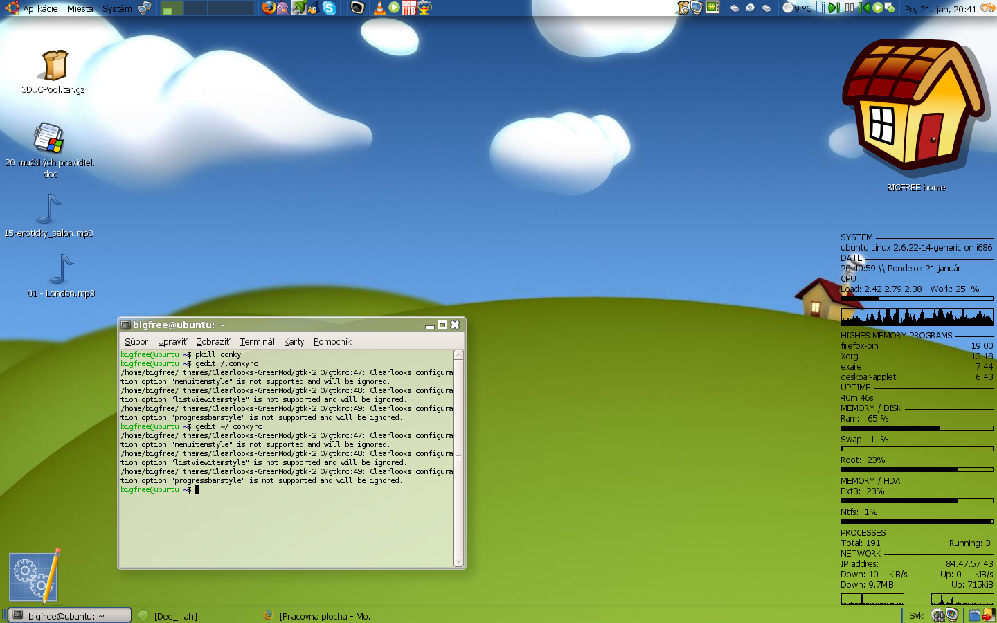 Pokud se nepletu tak to na screenshotu je prave conky. U me vypada treba takto: http://disk.jabbim.cz/vackar@jabber.cz/conky.png, ale graficka uprava je na kazdym, neni to tak slozity.