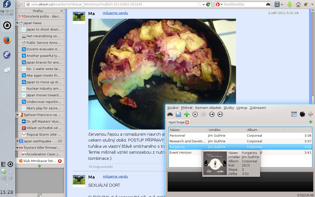 Ve Firefoxu doporučuju Tree Style Tab, VimFX (ovládání klávesnicí, ale umožňuje blacklisting webových aplikací typu Gmail a neblokuje klasické ovládání — na rozdíl od Pentadactylu/Vimperatoru) a Lazarus Form Recovery.