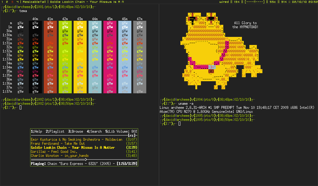 Tak jsem se nakonec zase poslusne vratil k Xmonadu. Tentokrat barvy sladene dohromady kde to jen slo. Stale zjistuju, ze cim jednodussi desktop mam, tim efektivnejsi jsem. Vypada to ze za chvili zdegeneruju az na jednolitou cernou plochu bez jakekoliv dekorace :-)