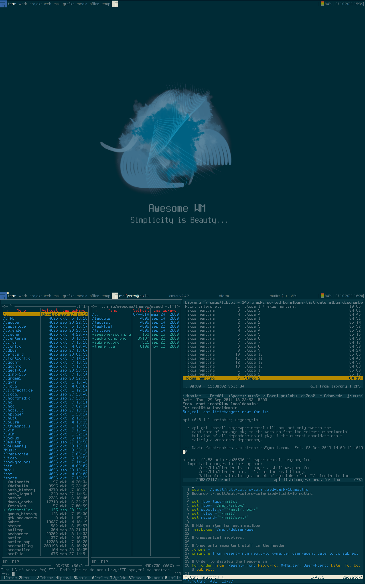 Inštaloval som len základný Debian s X a Awesome + filemanažer mc a ranger, editor vim, pošta mutt, IM klient centerim, video mplayer, pdf zathura a xpdf, obrázky feh a gimp, poznámky hnb, hudba cmus resp. moc, prehliadač Firefox, v systéme mám k dispozícii pre každý prípad ešte LOffice a Blender. Zistil som, že nič viac mi netreba.