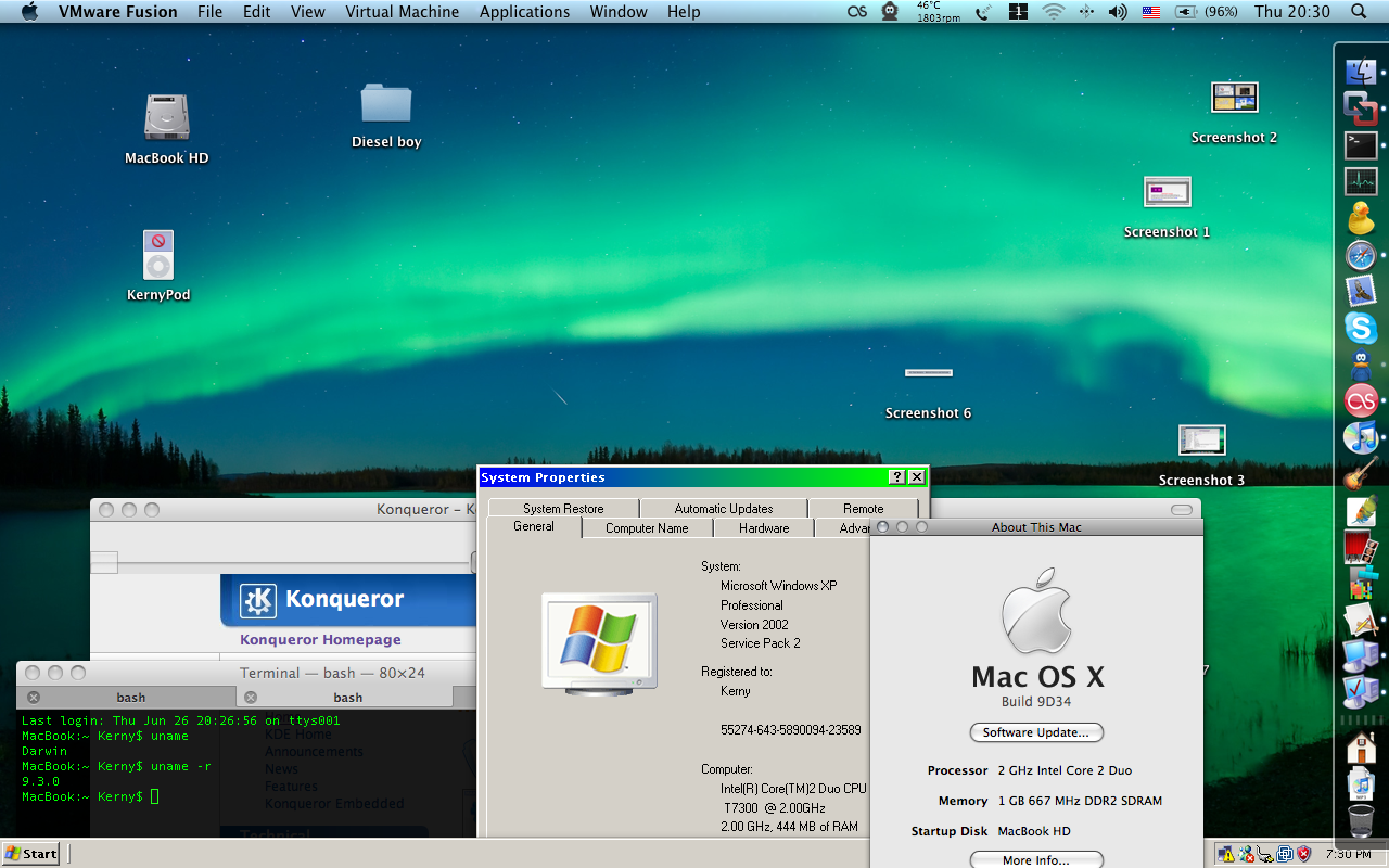 snazil jsem se udelat screen, kde bude spusteny osx, windows a nejaka aplikace preprezentujici prostredi KDE + aby bylo videt na desktop, kde je tapeta s polarni zari... windows pouzivam pouze na ultimu online a to jen malokdy, na osx delam vsechno a KDE 4 asi odinstaluju, protoze zabira 14GB (zomfg) na malym (80GB) disku..