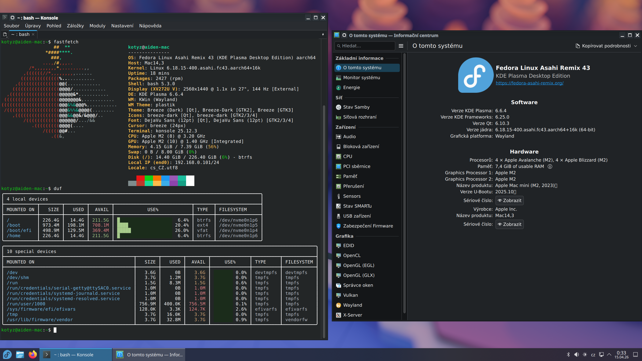 Fedora Linux Asahi Remix s KDE Plasma 6.6 na M2 Mac mini (fungl novej, 2 roky záruka, 7990 ve výprodeji). Téma Breeze Dark, klasika největší. Intel outside, ARM inside.