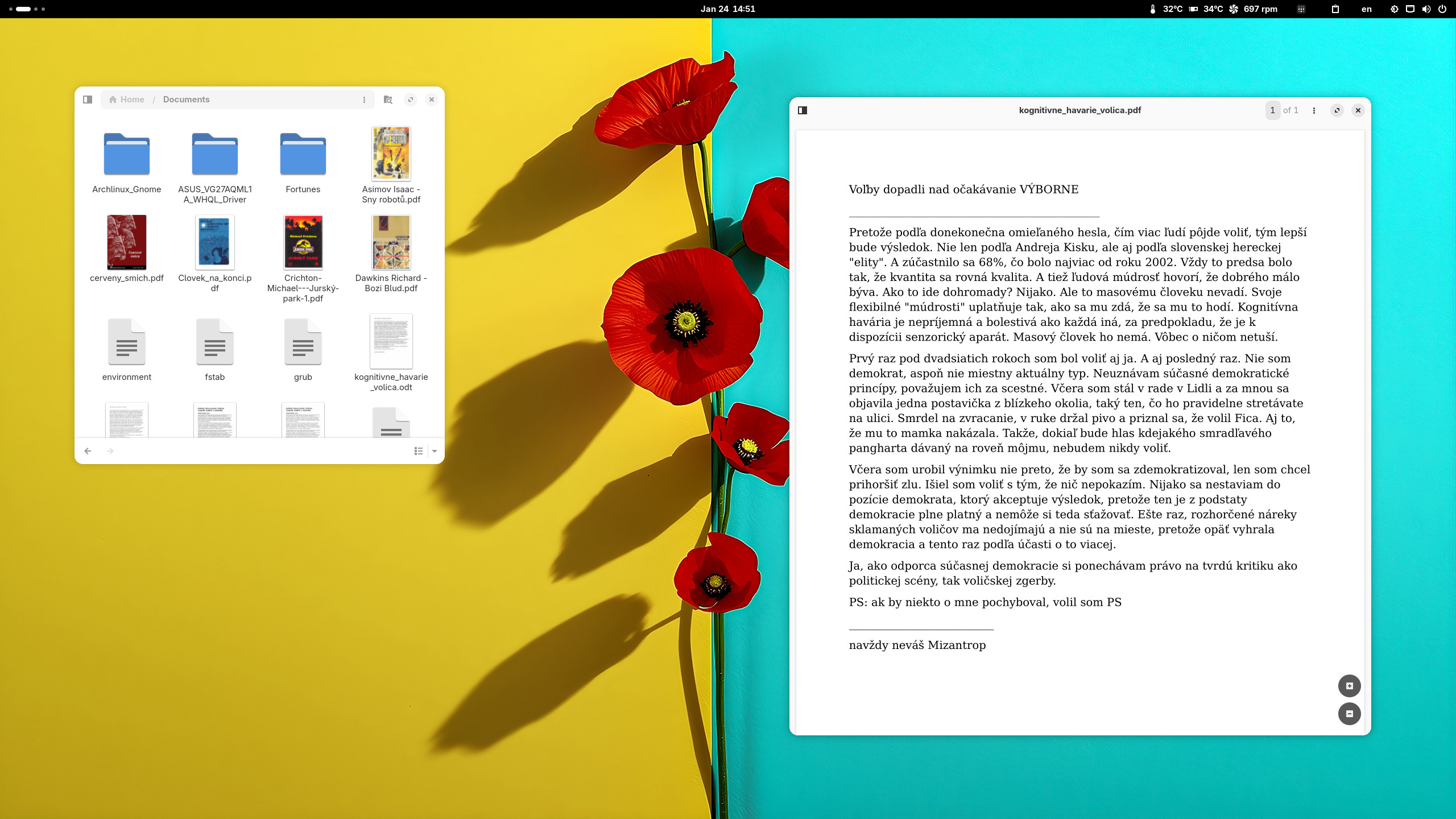 Vsadil som na Gnome. Dúfam, že bude šlapať ako hodinky. Ale stále ma myká, že sa vrátim k tilingu. S waylandom asi jedine Sway. Ten cirkusový humbug Hyprland ma odpudzuje.