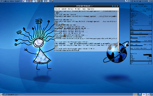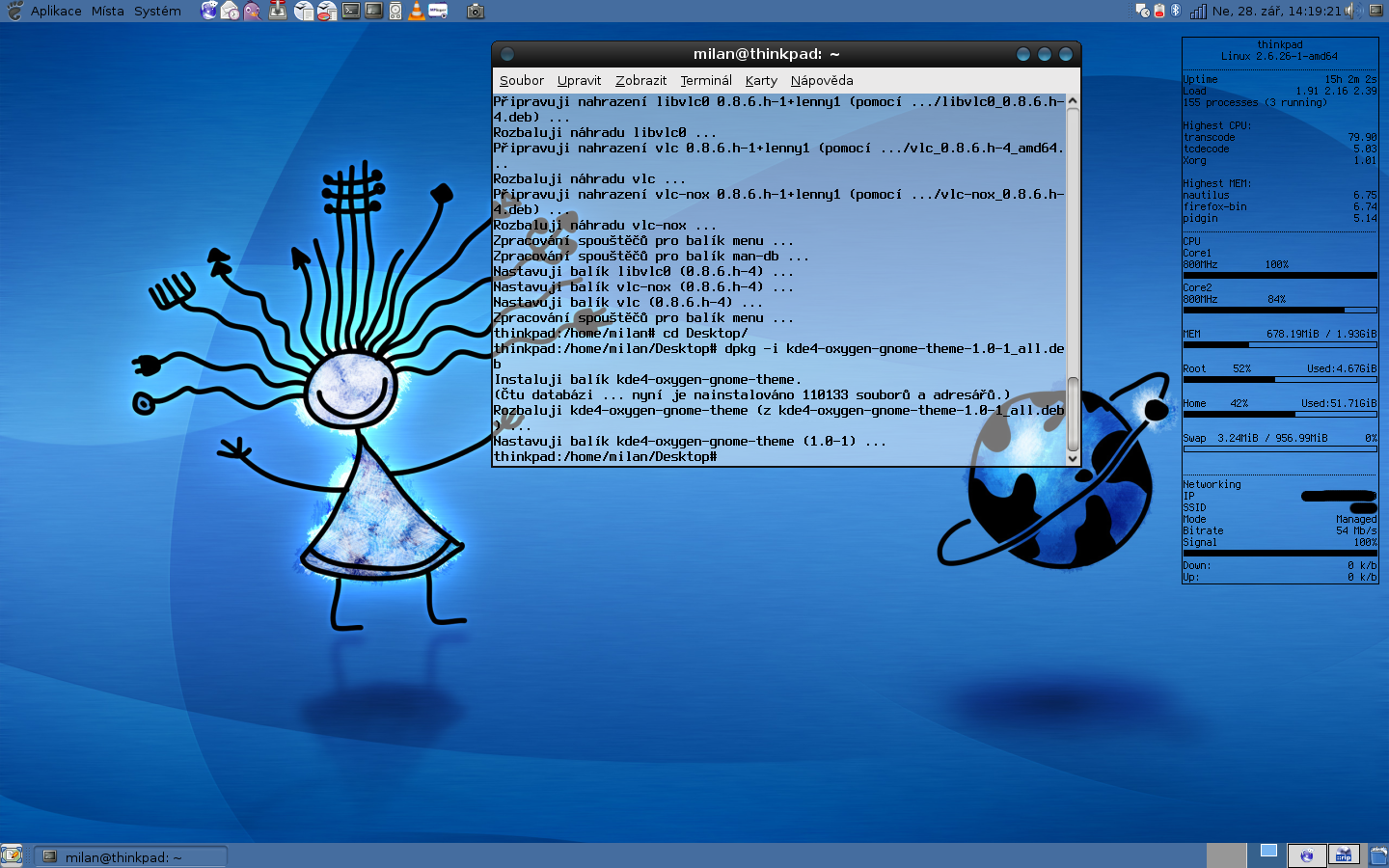Toto je moje Gnome na Debianu Lenny. Ovládací prvky-kde4-oxygen a okraj oken humanoid-osx-black z gnome-look.org. Tapeta je z vladstudio.com, to asi poznal každý.