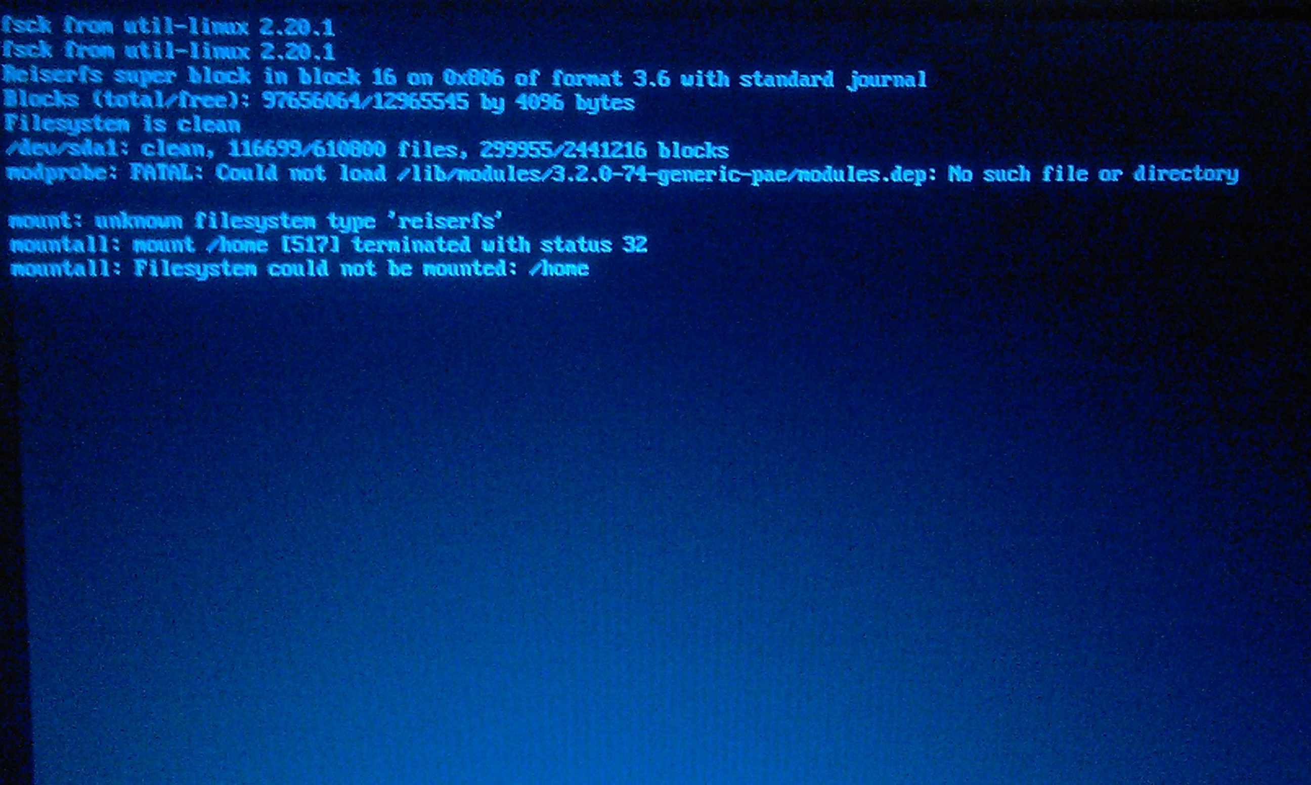 Naposledy sem odebiral ze systemu vetsinu kernelu , usetril sem 2GB mista, nechal sem jen aktualne pouzivany, myslite ze to muze byt tim? podotykam ze ty jadra jsem odinstaloval pres spravce balicku a ne prasacky deletovanim ;)Vzhľadom na to, že absentuje súbor s náväznosťami modulov (ovládačov) v adresáriCould not load /lib/modules/3.2.0-74-generic-pae/modules.dep: No such file or directory mount: unknown filesystem type 'reiserfs'