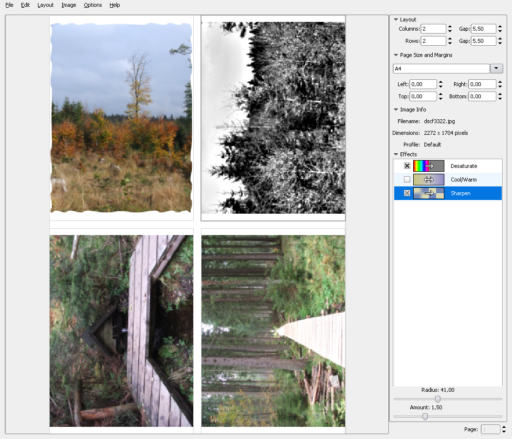 Umožňuje „zarámování“ fotografií pomocí libovolné masky a nastavení jejich počtu na výšku a na šířku stránky. Fotografie umí automaticky otáčet, zvládá také správu barev a různé efekty.