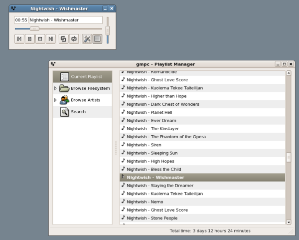 gmpc je klientem pro MPD (a GNOME). Jeho hlavním cílem je zpřístupnit všechny možnosti MPD démona a přitom být stále rychlým a snadno použitelným přehrávačem.