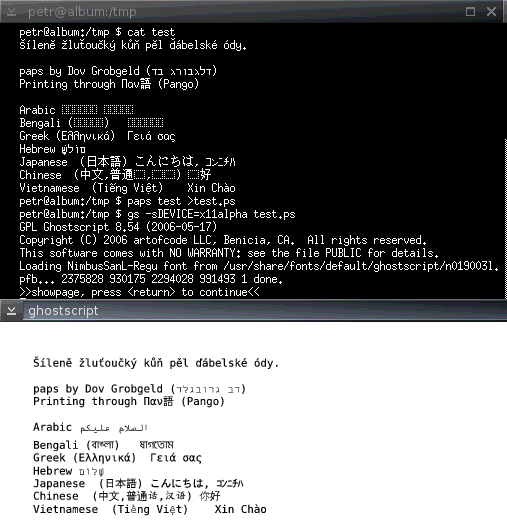 Vhodné pro tisk textových výstupů, kde tradiční a2ps selhává. Nahrazování symbolů chybějících v upřednostňovaném fontu je samozřejmé.