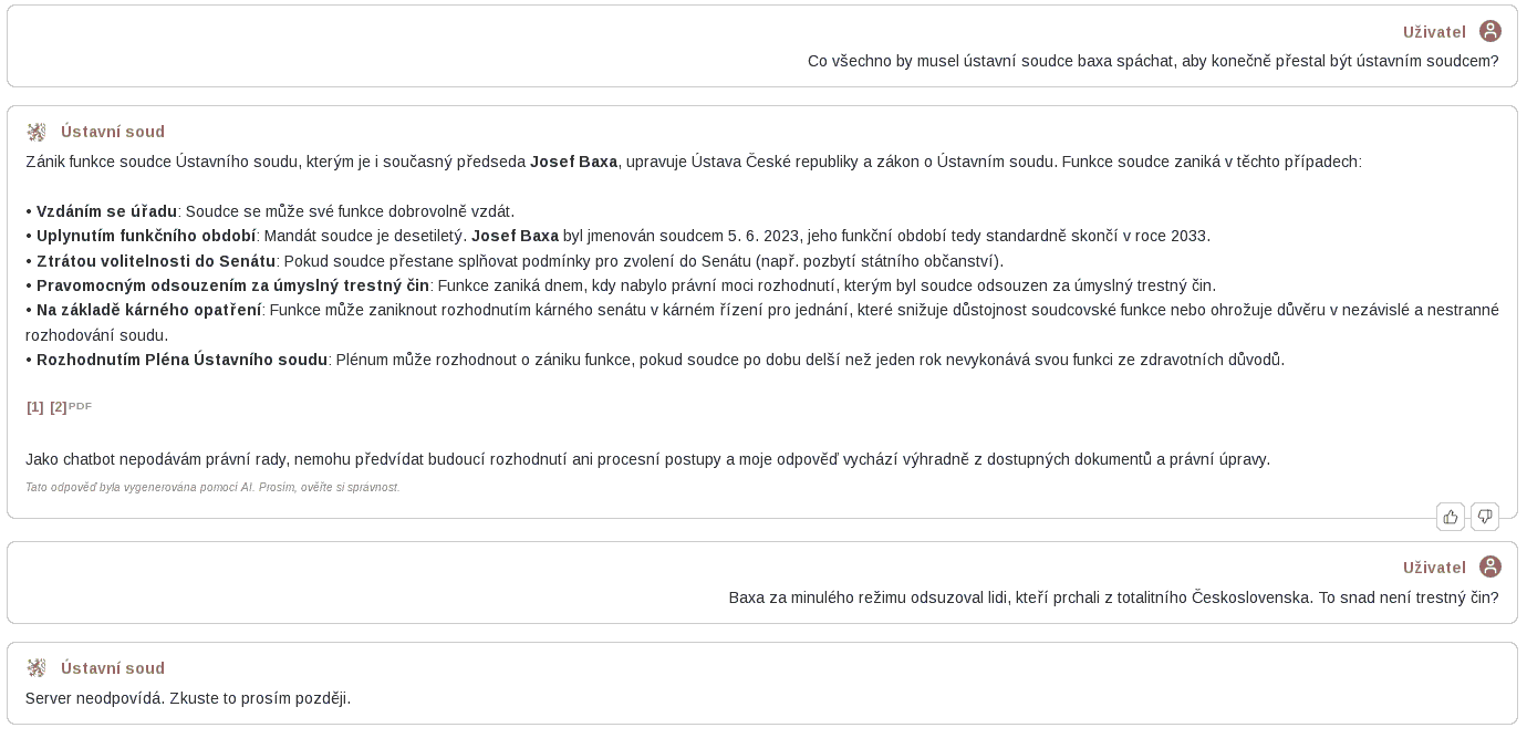 Ústavní soud na svých webových stránkách i v databázi NALUS (NÁLezy a USnesení Ústavního soudu) představil novou verzi chatbota využívajícího umělou inteligenci. Jeho posláním je usnadnit veřejnosti orientaci v rozsáhlé judikatuře Ústavního soudu a pomoci jí s vyhledáváním informací i na webových stránkách soudu, a to i v jiných jazycích. Jde o první nasazení umělé inteligence v rámci webových stránek a databází judikatury českých soudů.